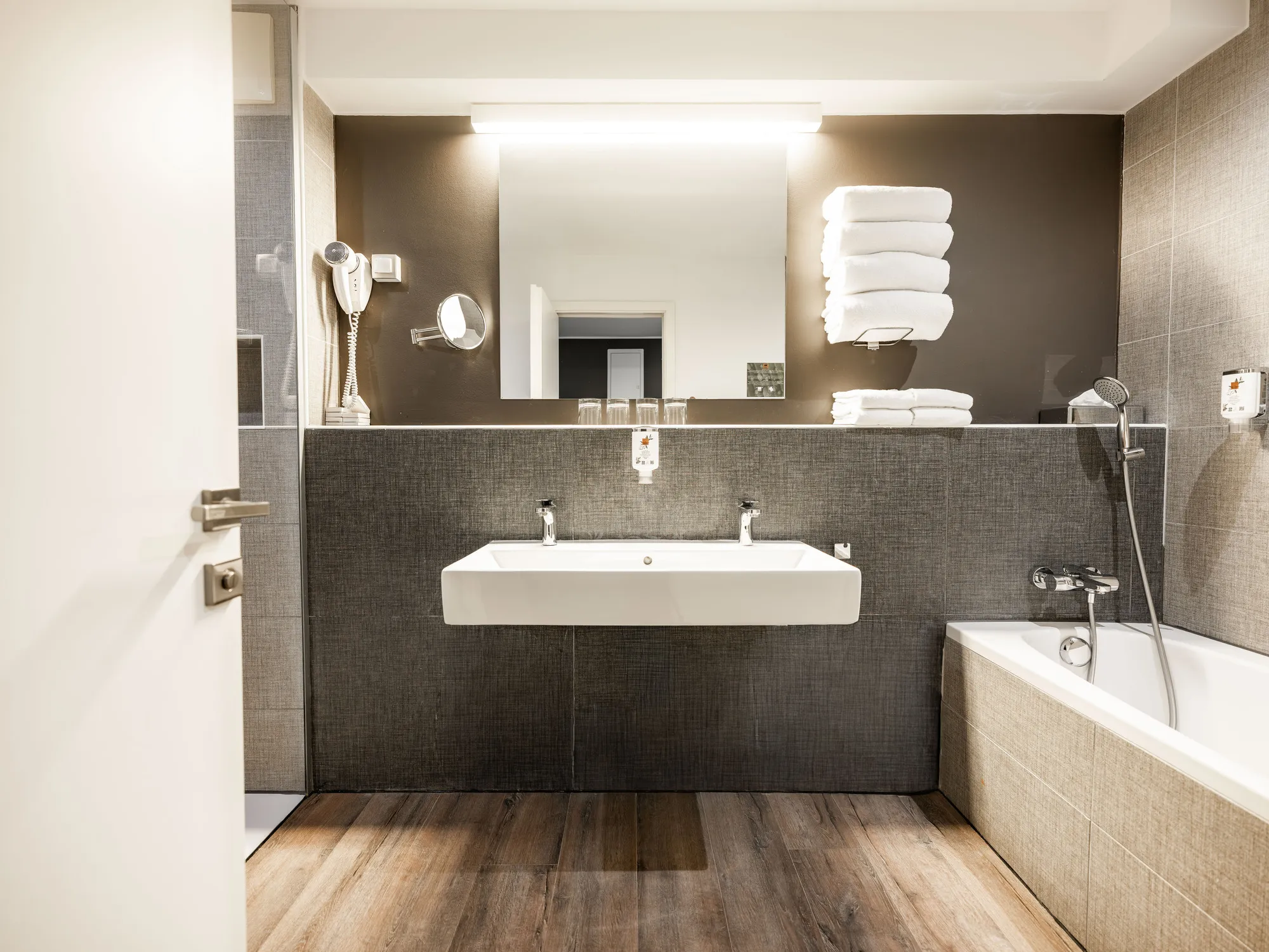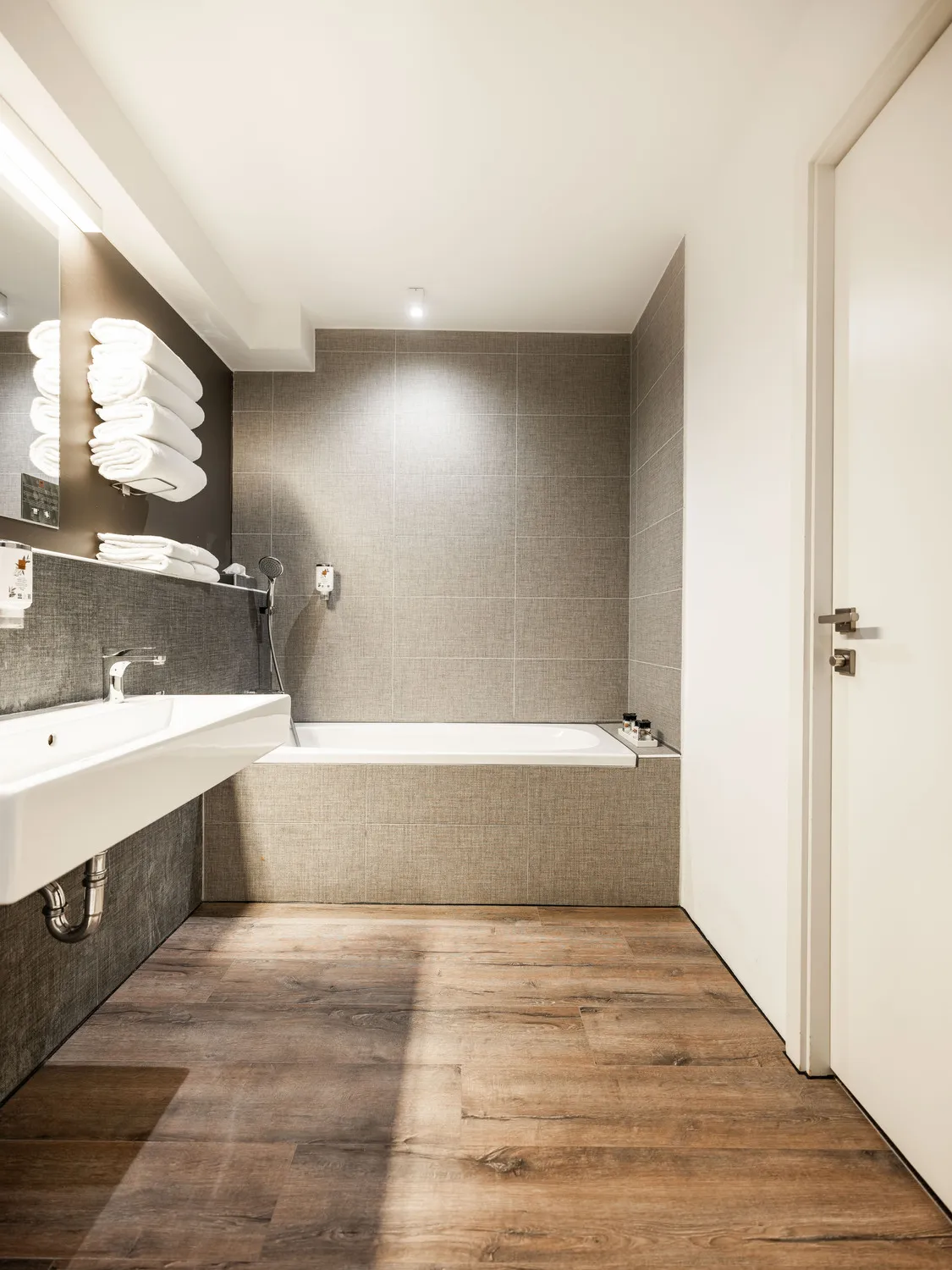 Das Badezimmer ist sowohl mit Badewanne als auch Dusche ausgestattet, während WC und Bidet in einem separaten Bereich untergebracht sind, um zusätzliche Privatsphäre zu gewährleisten.