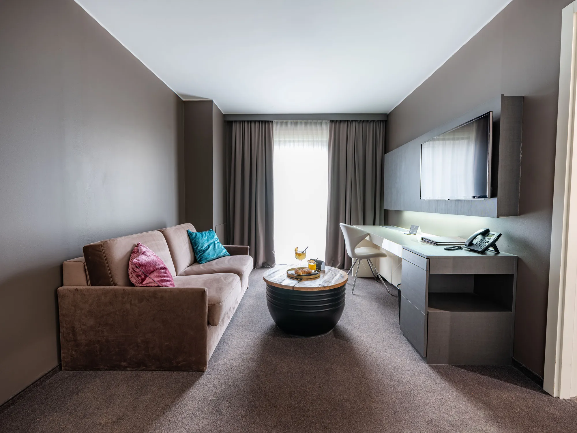 Die Suite verfügt über ein komfortables King-Size-Bett (180 × 200 cm) sowie einen separaten Wohnbereich mit einer Sitzgarnitur, die bei Bedarf in ein Zusatzbett umgewandelt werden kann. Der Raum ist so gestaltet, dass er ein wohnliches Gefühl mit Komfort und klassischem Hotelcharakter verbindet.