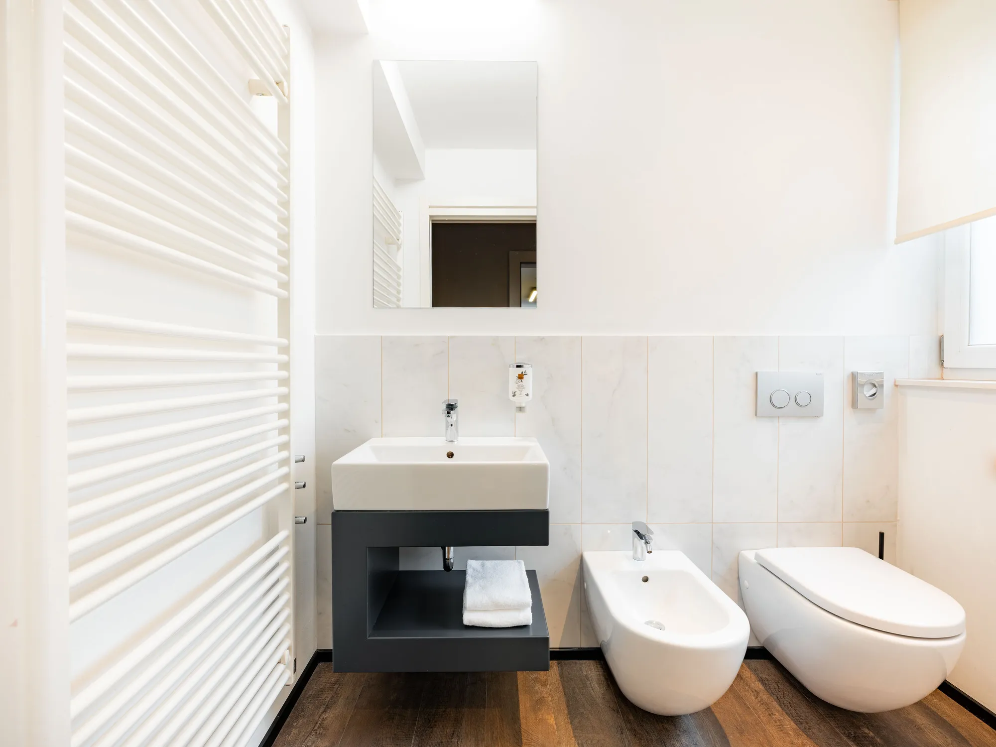 Das Badezimmer ist sowohl mit Badewanne als auch Dusche ausgestattet, während WC und Bidet in einem separaten Bereich untergebracht sind, um zusätzliche Privatsphäre zu gewährleisten.