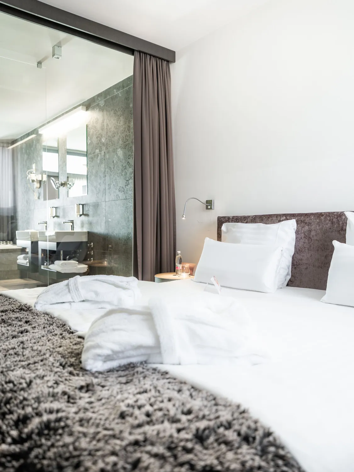 Die Royal Suite bietet auf 45 m² großzügigen Komfort und stilvolle Eleganz mit einem der schönsten Ausblicke der Stadt – direkt auf die Drau, deren morgendliche und abendliche Spiegelungen eine einzigartige Atmosphäre schaffen, wie man sie in Maribor kein zweites Mal findet.
