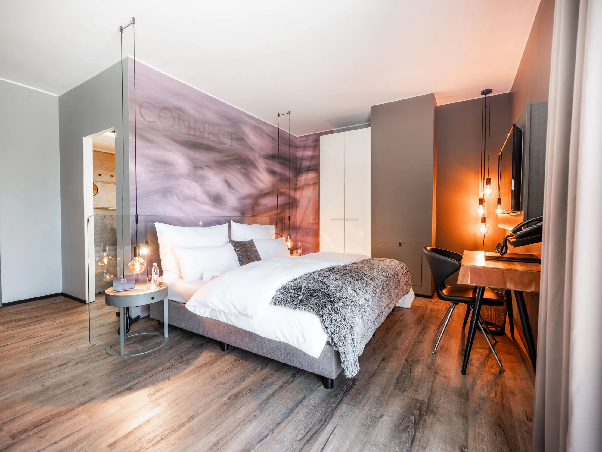 Die Standard Premium Zimmer sind von zwei künstlerischen Themen geprägt – Let’s Dance und Connect. Beide sind Teil der Kunstkollektion Dreams at River Drava und verleihen dem Raum Wärme, Charakter sowie eine zeitgemäße Atmosphäre mit klarer visueller Identität.