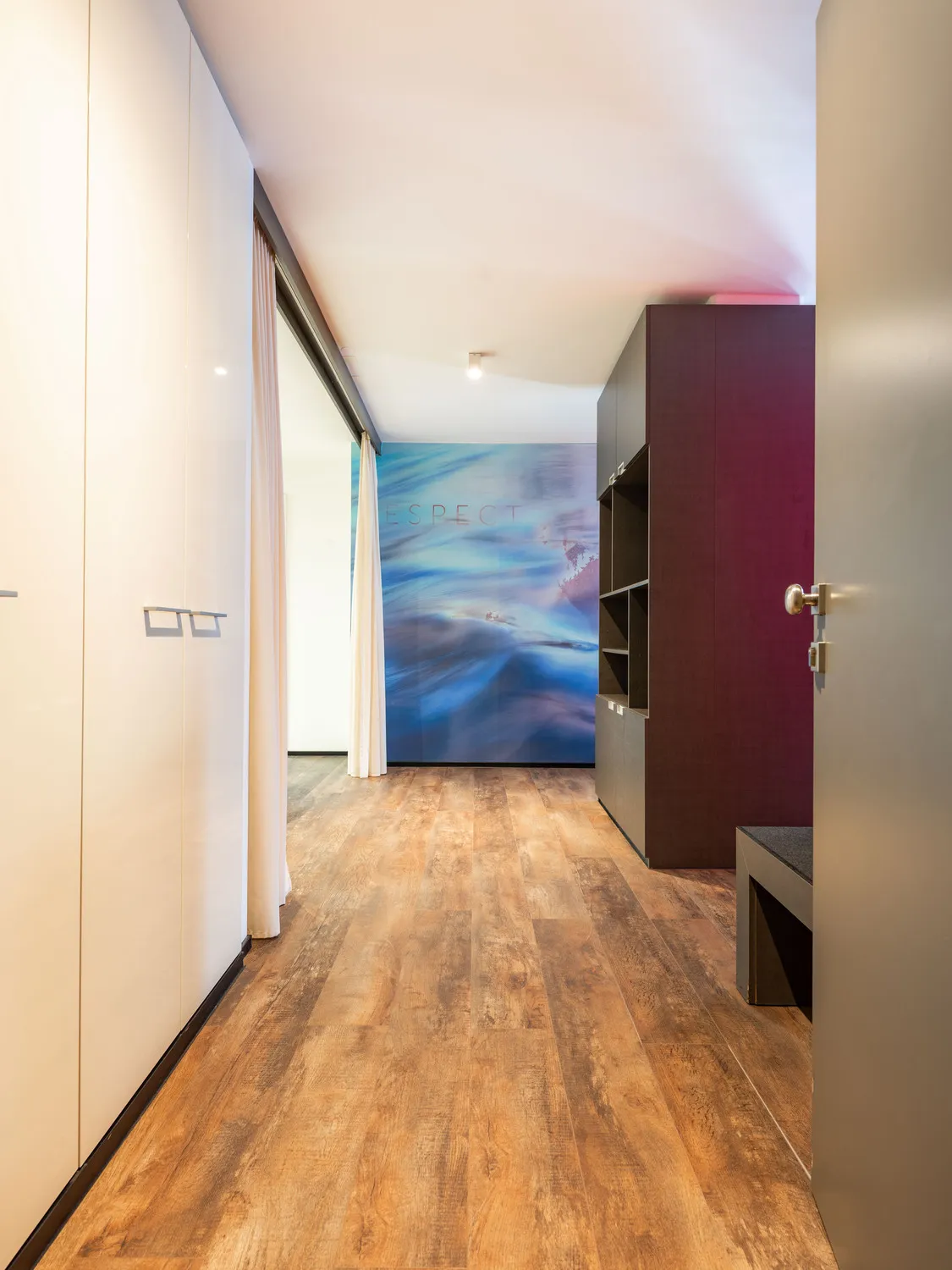 Die Wellness-Suite bietet auf 45 m² Komfort und Entspannung und richtet sich an Gäste, die das Besondere suchen. Ein besonderes Highlight ist das große Wasserbett, das ein einzigartiges, sanftes und tiefenentspannendes Schlaferlebnis ermöglicht. Die Suite verfügt über ein separates Schlafzimmer sowie einen komfortablen Wohnbereich mit einer Sitzgarnitur, die bei Bedarf in ein zusätzliches Bett umgewandelt werden kann.