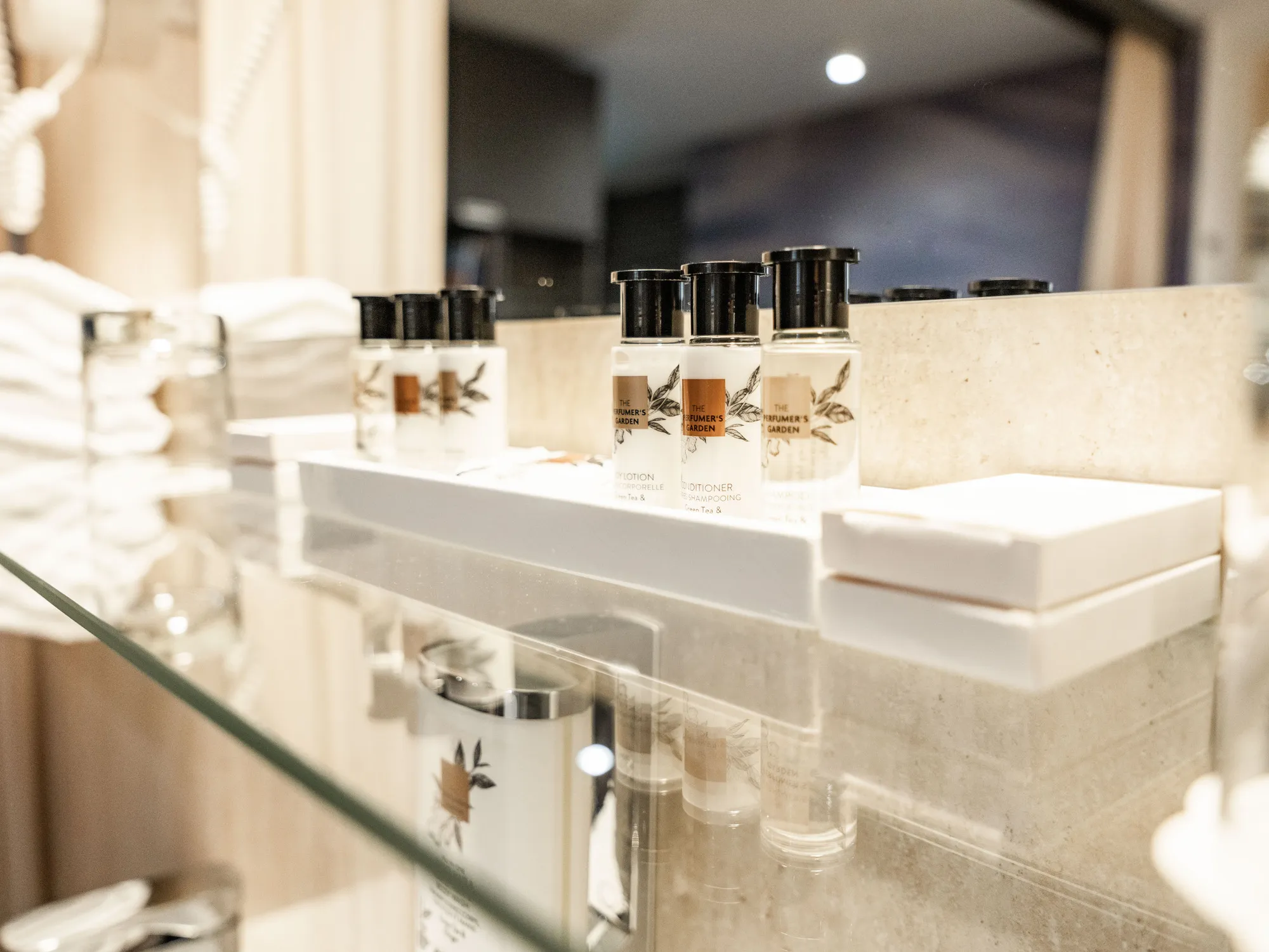 Das Badezimmer ist sowohl mit Badewanne als auch Dusche ausgestattet, während WC und Bidet in einem separaten Bereich für zusätzlichen Komfort und Privatsphäre untergebracht sind. Zudem verfügt die Suite über alle standardmäßigen Hotelausstattungen, darunter Minibar, TV und vollständige Schallisolierung.