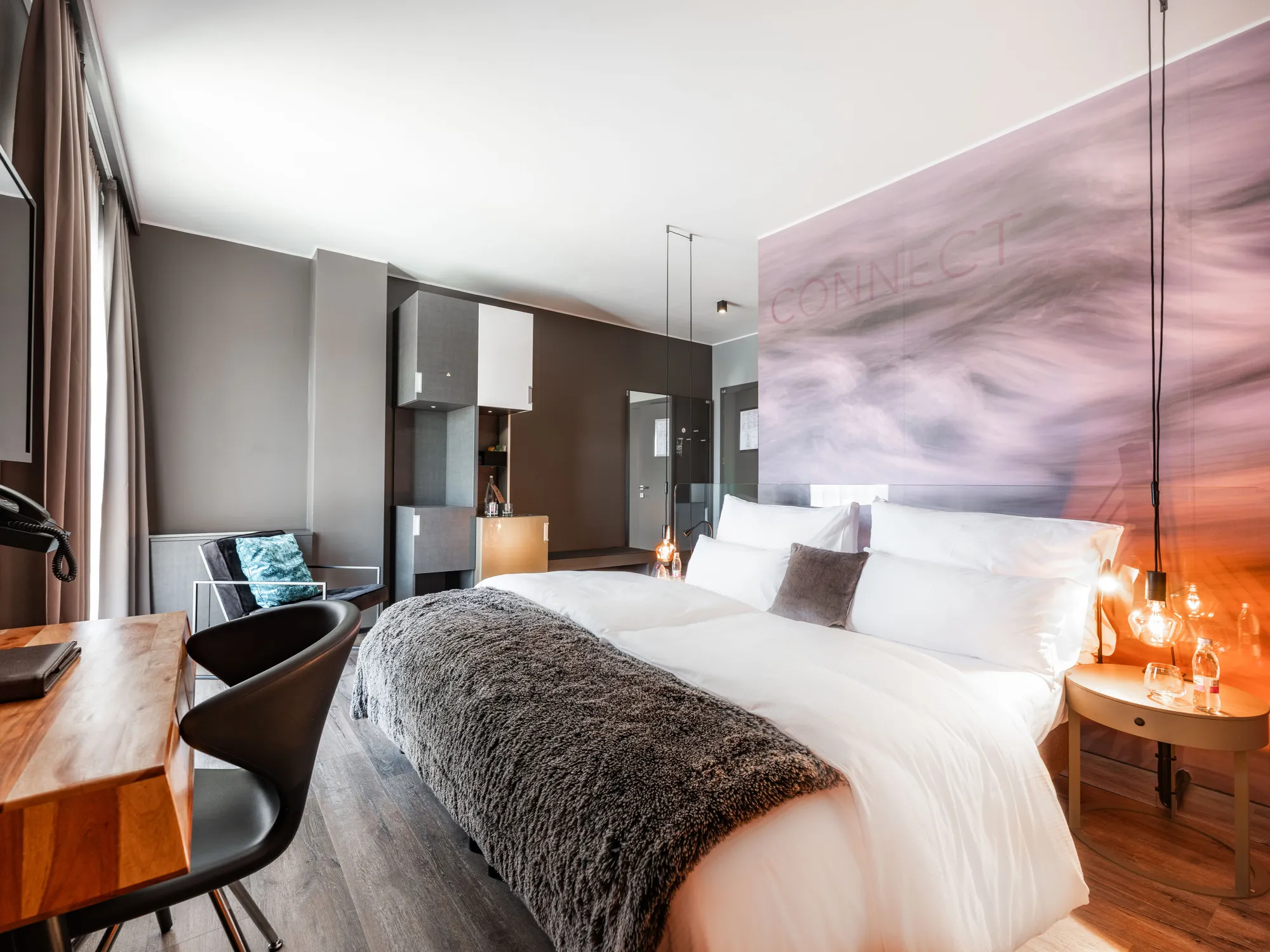 Connect predstavlja povezanost mesta, ljudi in reke. Vizualni motivi so bolj umirjeni in topli, kar sobi daje prijeten občutek harmonije. Ambient deluje sproščeno, mehko in gostoljubno — idealno za popoln počitek.