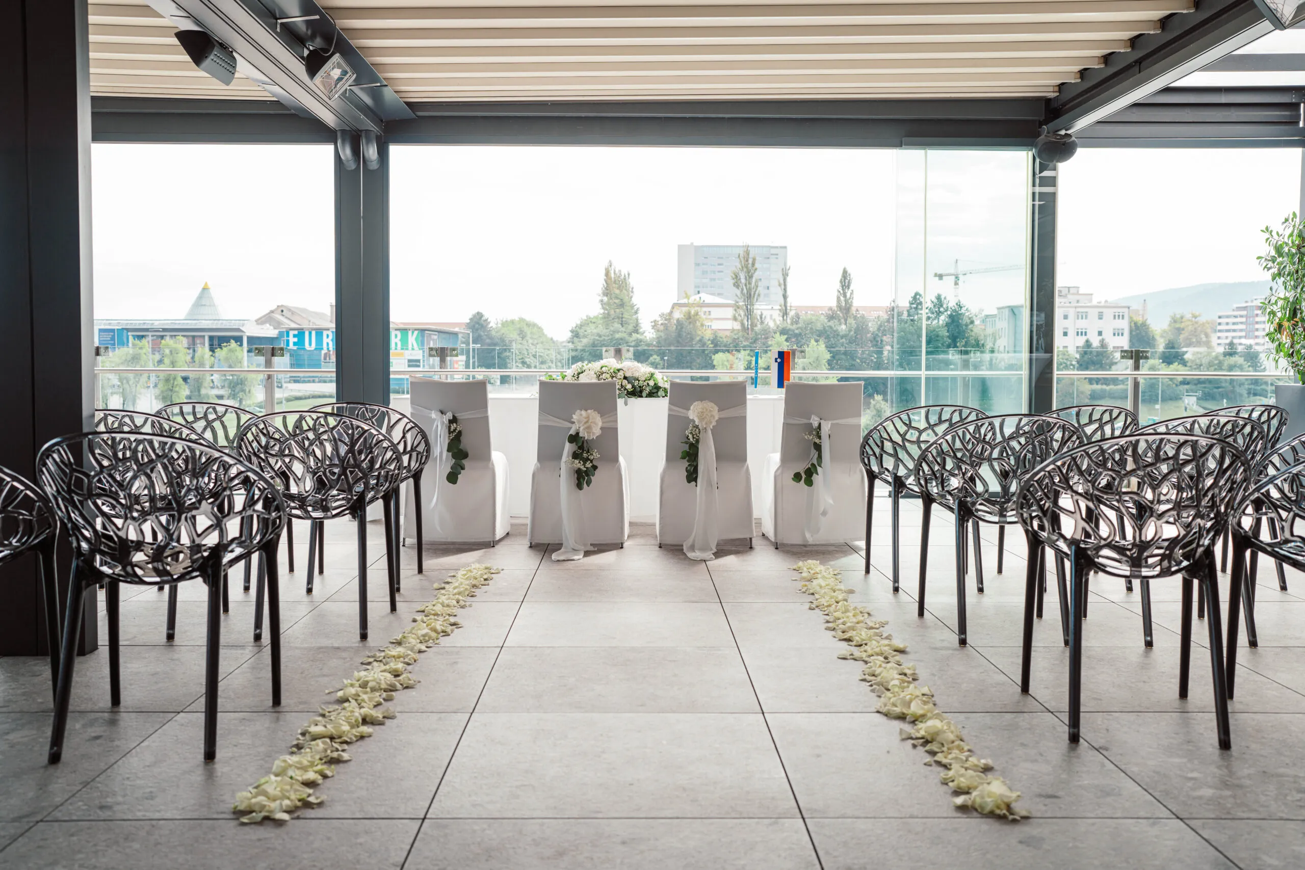 Pri pripravi poroke bo ekipa izkušenih strokovnjakov skrbno prisluhnila vsem vajinim željam, tako pri okrasitvi prostora,  kot pri izbiri poročnega jedilnika in izvrstnih lokalnih in tujih vin. Vajinemu dnevu se bomo skrbno in predano posvetili, pa naj bo to organizacija celotnega dogodka, obred na najlepši terasi mesta Maribor ali pogostitev z zabavo.